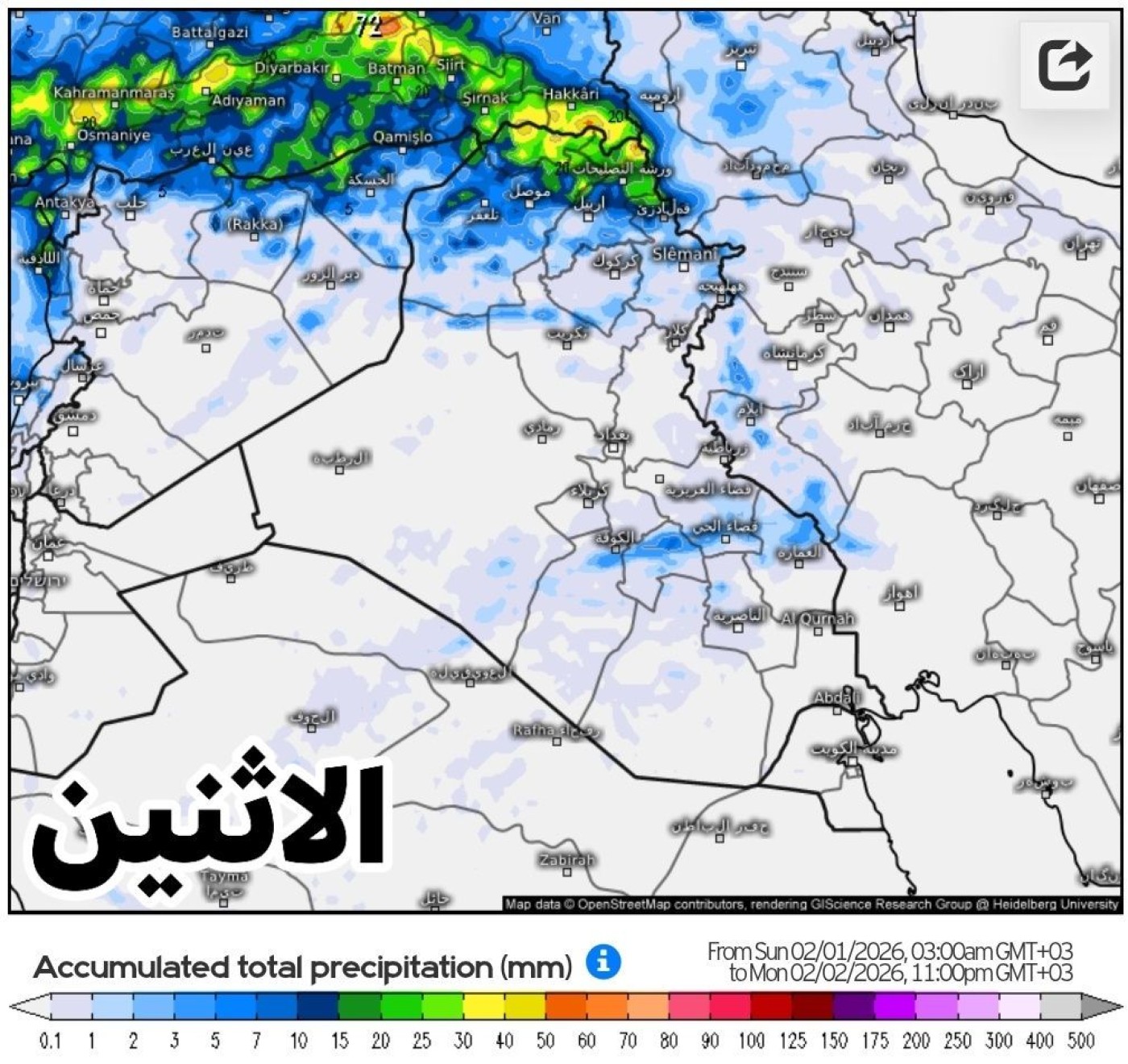 تشير آخر تحديثات الطقس في العراق، الأحد 1 شباط 2026، إلى تأثر أغلب المدن الشمالية من البلاد، بزخّات أمطار متفاوتة الشدة، بالإضافة إلى تأثر مدن في وسط وجنوب البلاد، بأمطار رفقة نشاط في البرق والرعد.