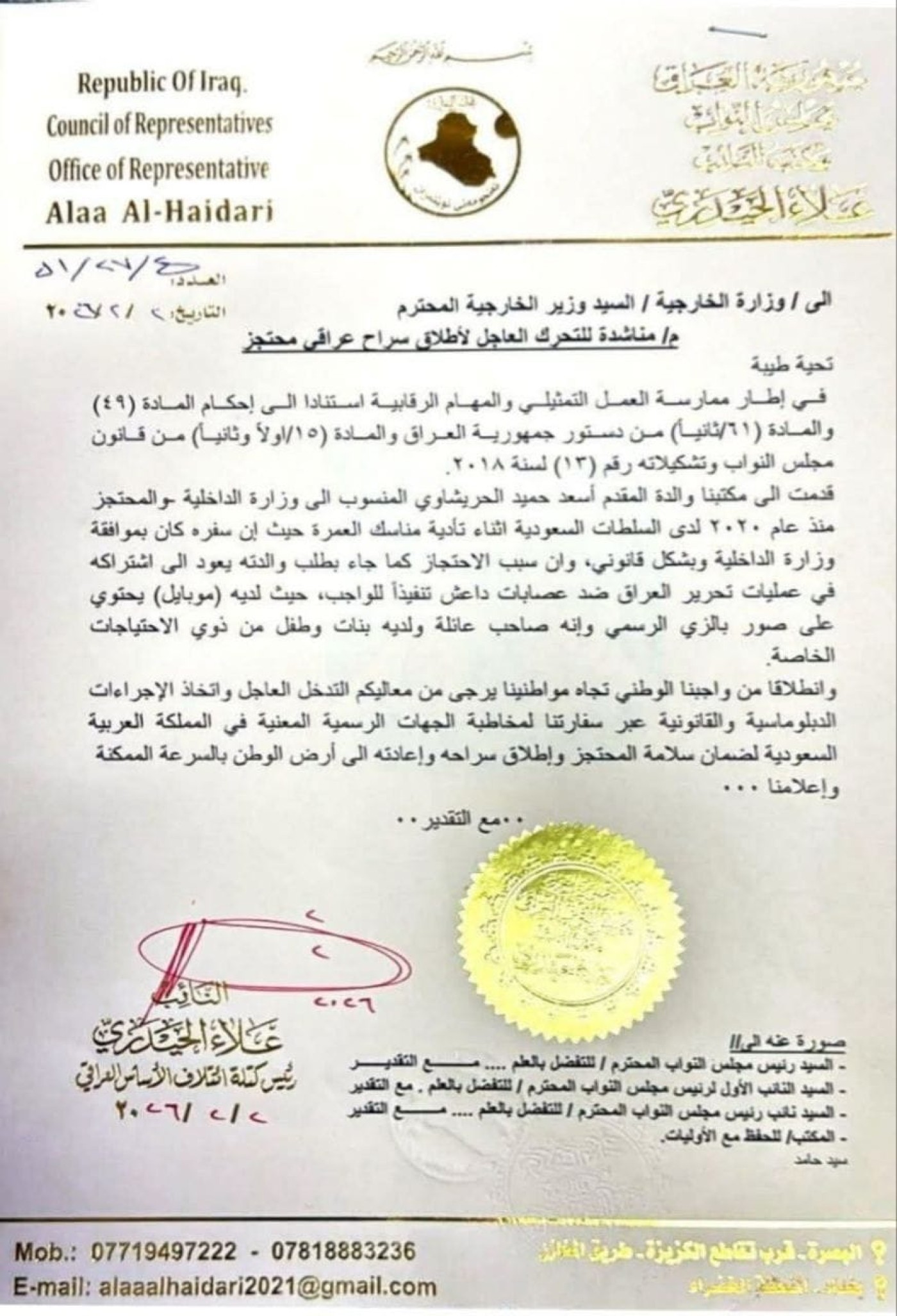 وناشدت الكتلة البرلمانية وزارة الخارجية العراقية بـ "التدخل العاجل" و"اتخاذ الإجراءات الدبلوماسية والقانونية عبر سفارتنا لمخاطبة الجهات الرسمية المعنية في المملكة العربية السعودية لضمان سلامة المحتجز وإطلاق سراحه وإعادته الى أرض الوطن بالسرعة الممكنة".
