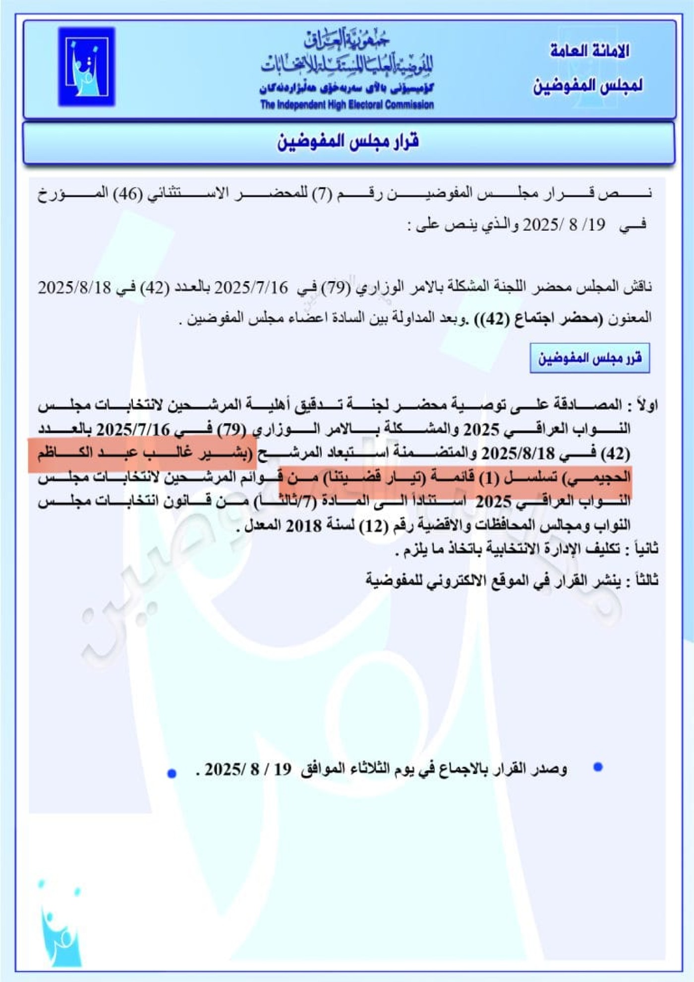 وجاء في قرار مجلس المفوضية، "المصادقة على توصية محضر لجنة تدقيق أهلية المرشحين لانتخابات مجلس النواب العراقي 2025 والمتضمنة استبعاد المرشح بشير غالب عبد الكاظم الحجيمي تسلسل (1) قائمة تيار قضيتنا من قوائم المرشحين لانتخابات مجلس النواب العراقي استناداً إلى المادة 7 ثالثاً من قانون انتخابات مجلس النواب".