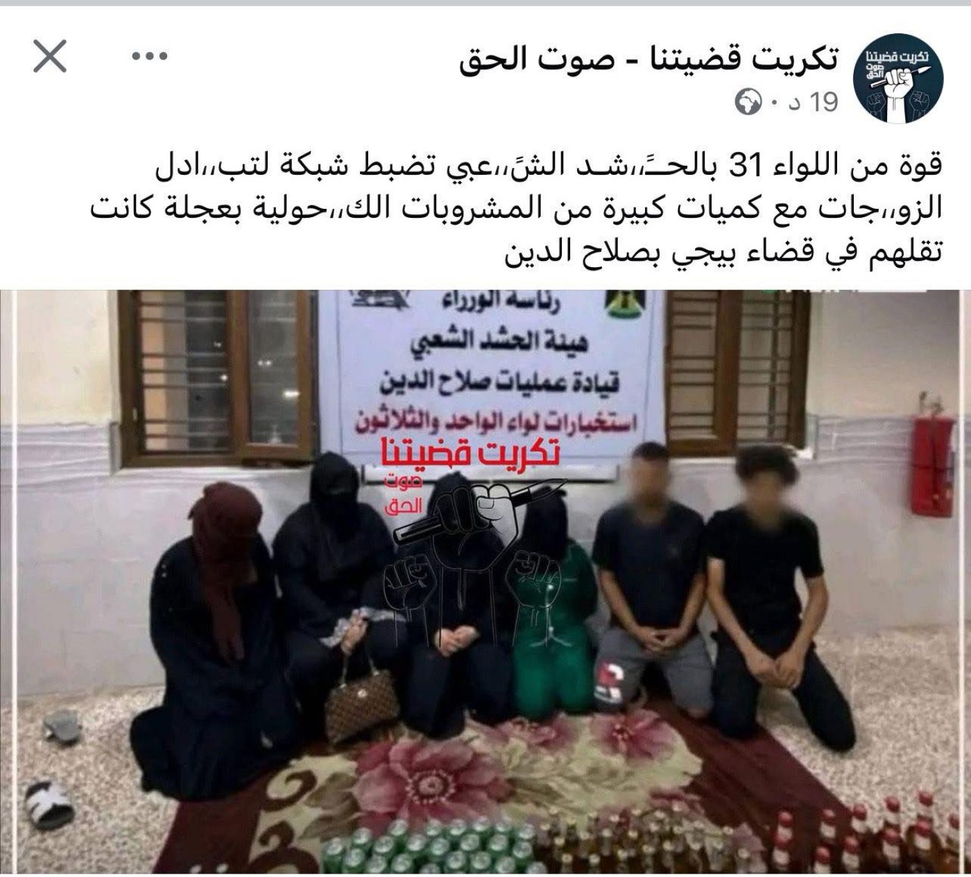 وقال علي في بيان تلقت "الجبال" نسخة منه، "تناقلت بعض الصفحات الوهمية المدسوسة، منشوراً مفاده أنه تم إلقاء القبض على مجموعة تابعة للمدعوة (ام- ع) نساء ورجال لتبادل الزوجات وبيع المشروبات الكحولية في قضاء بيجي، إذ نبين للرأي العام أن هذا المنشور يراد منه الإساءة لأهالي بيجي أخلاقياً واجتماعياً. أما فيما يخص الصورة أدناه، فهي تعود لمجموعة مارقة تم إلقاء القبض عليها قبل أربعة أيام من قبل الأجهزة الأمنية في القضاء، وبحوزتهم مشروبات كحولية، وليس هناك أي ما يثبت تبادل الزوجات لهذه المجموعة الخارجة عن القانون، حيث تم إيداعهم التوقيف حسب قرار قاضي محكمة تحقيق قضاء بيجي، وسينالون جزاءهم العادل، وسيتم ترحيلهم خارج القضاء لأنهم ليسوا من سكنة أهالي قضاء بيجي".