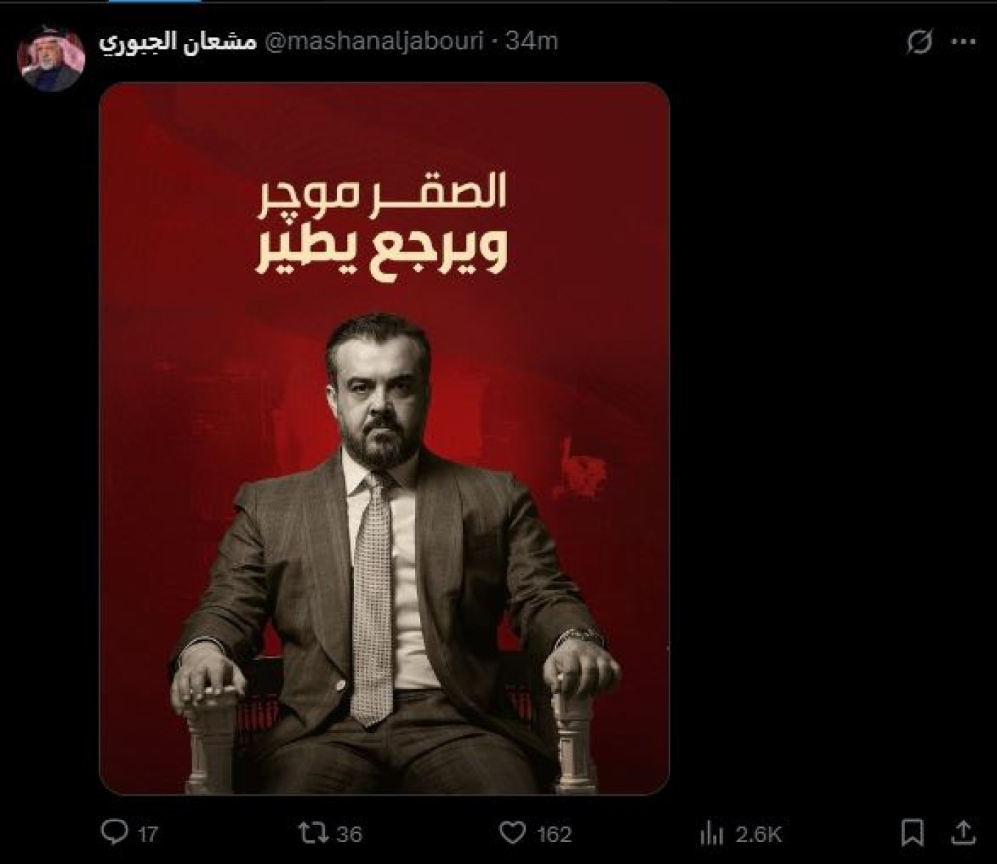 وقال الجبوري في تدوينة مقتضبة باللهجة العراقية بشأن استبعاد نجله "يزن"، "الصقر موجر ويرجع يطيري".
