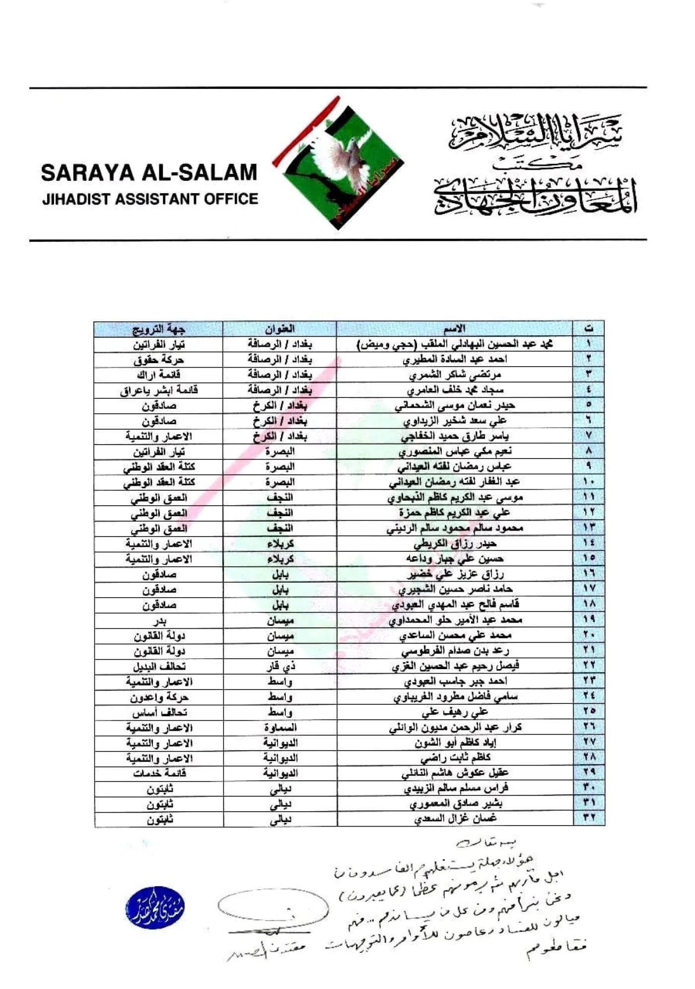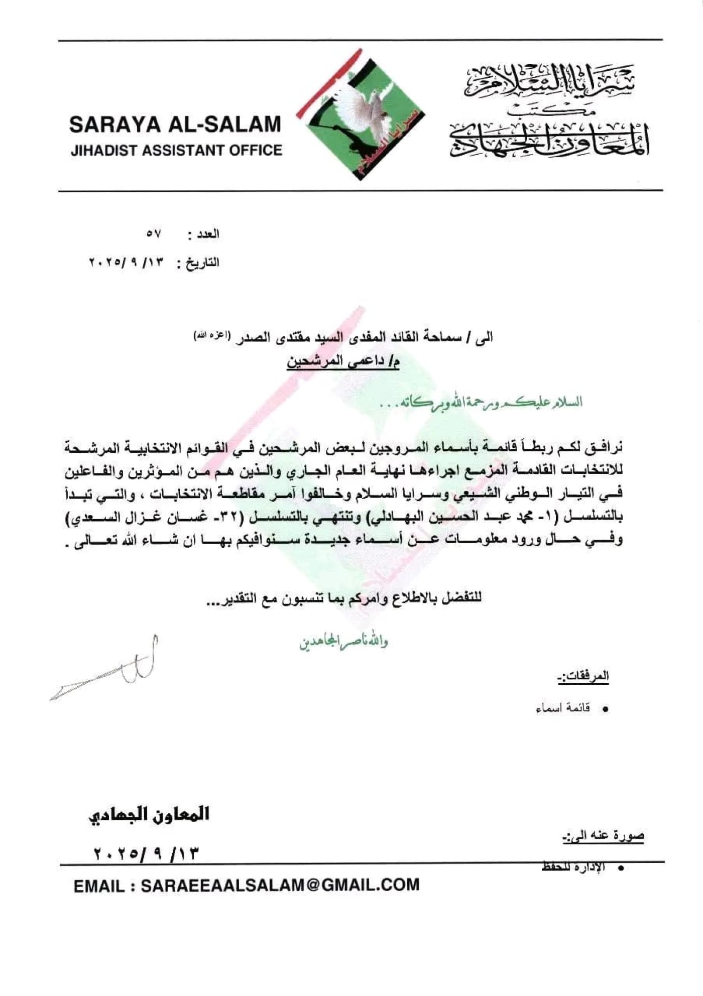 وأعلن مكتب الصدر في النجف، اليوم السبت 13 أيلول 2025، عن قائمة تتضمن أسماء 32 عضواً في التيار الوطني الشيعي وسرايا السلام، قال إنهم روّجوا لمرشحين في الانتخابات، وأعلن الصدر تبرؤه منهم.