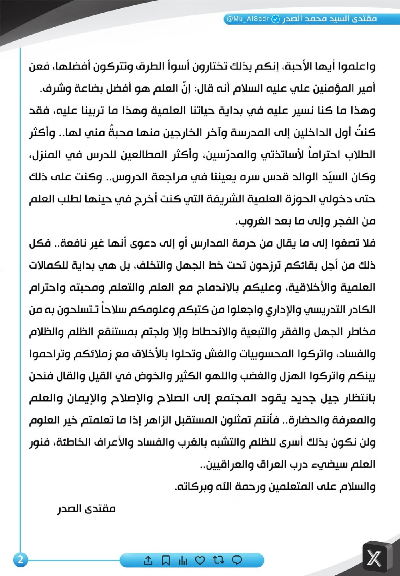 انتقد زعيم التيار الصدري، مقتدى الصدر، انتشار المقاطع المتداولة في مواقع التواصل الاجتماعي، التي "تزيد من الكراهية للمدارس والدوام".