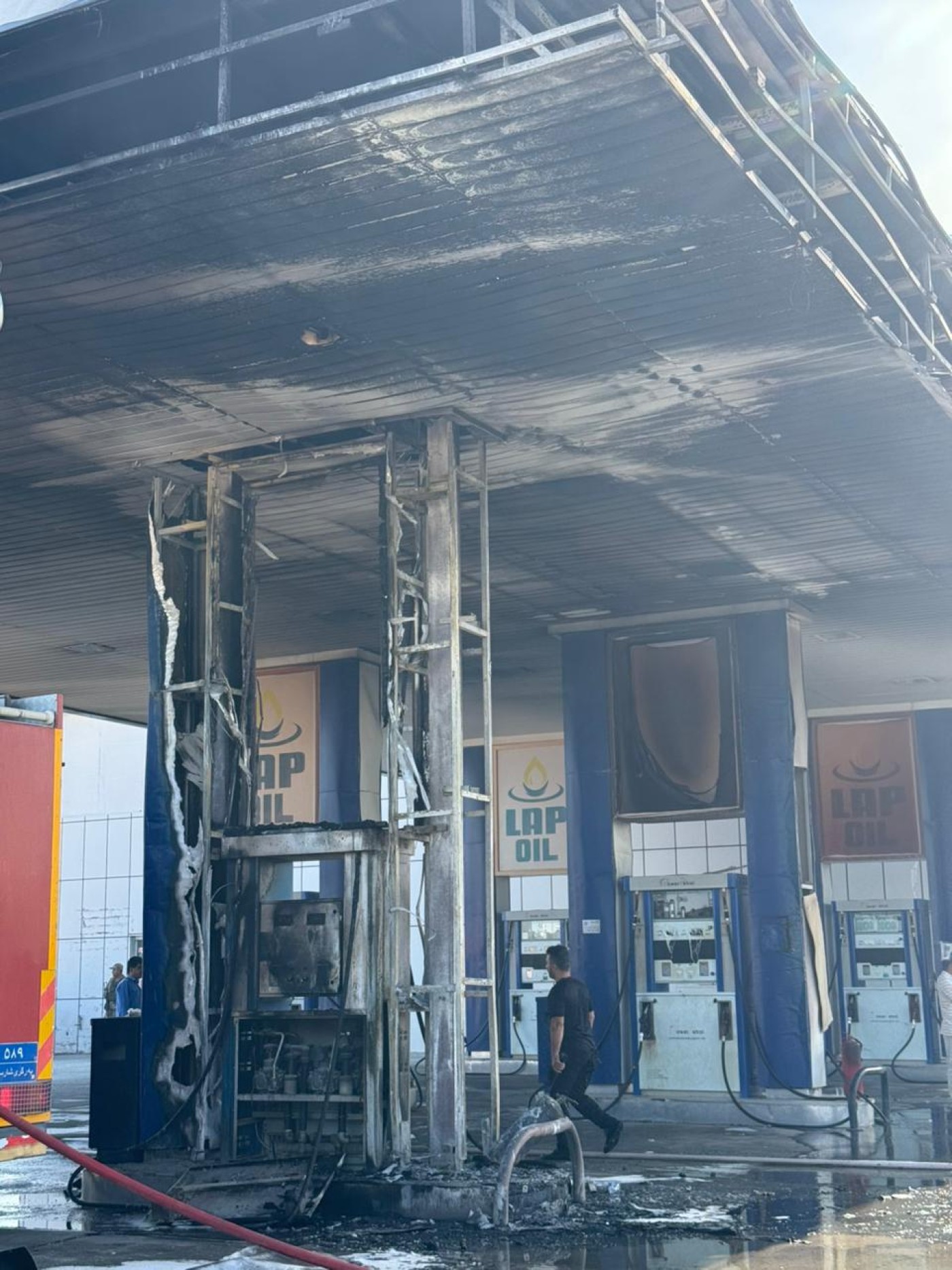 وتظهر صور التقطت في الموقع خسائر مادية كبيرة بالمكان، حيث التهمت السنة اللهب محطة الوقود بالكامل.