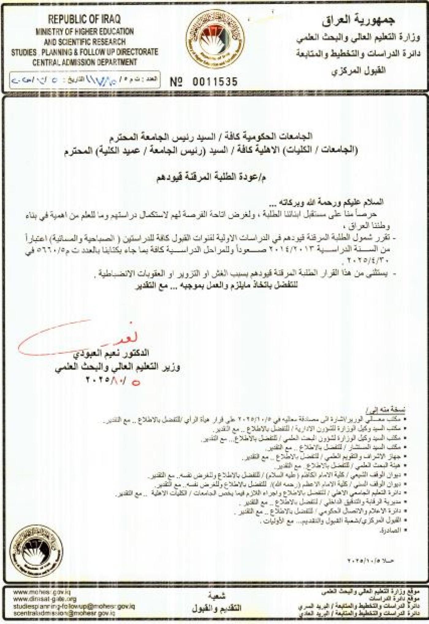 أعلنت وزارة التعليم العالي والبحث العلمي، الأحد 5 تشرين الأول 2025، شمول طلبة الدراسات الأولية في جميع المراحل بعودة المرقنة قيودهم.